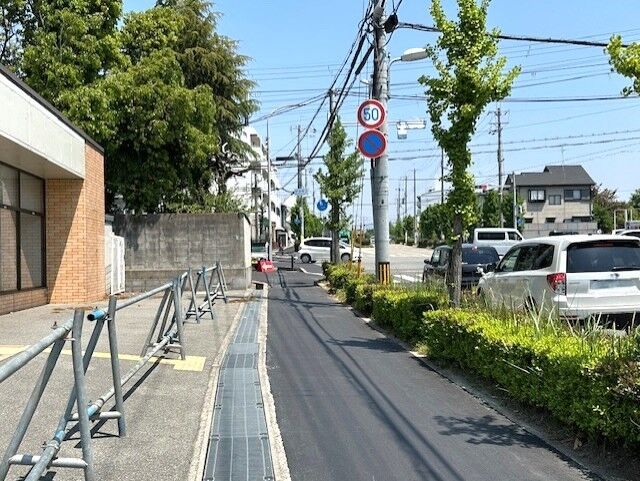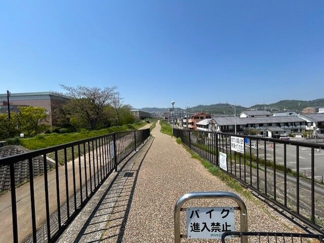 「バイク進入禁止」です。左手に見えるのは「大阪芸術大学短期大学部」です。