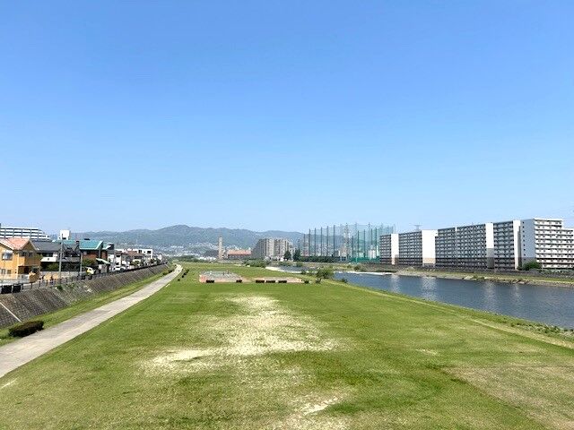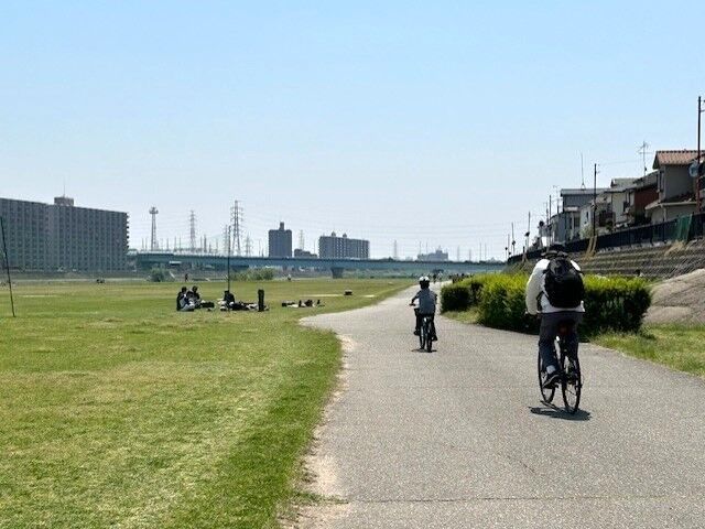 武庫川河川敷は芝生で休む人、スポーツを楽しむ人、ウォーキングやサイクリングの人達で賑わっていました