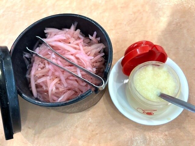 紅しょうがとニンニクのすりおろし。九州ラーメンには紅しょうがは欠かせませんね。紅しょうがといっても、甘酢につけたピンク色のしょうがなのが嬉しいです。
