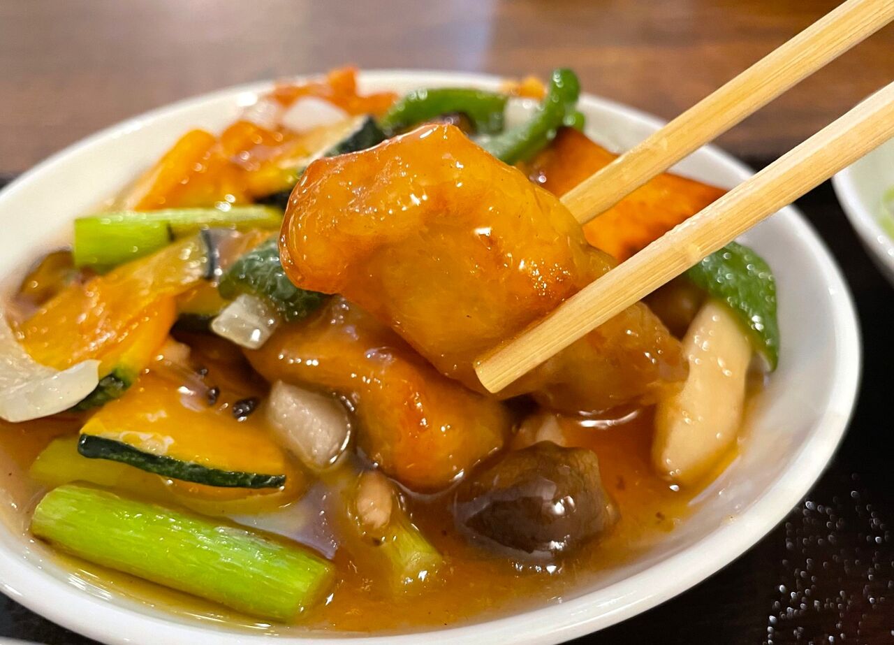まずはお皿から溢れんばかりの山盛り酢豚。豚肉以外にも、確認できただけでしめじ、パプリカ、かぼちゃ、たまねぎ、なす、さつまいも、アスパラ…7種類ものカラフルなお野菜が!