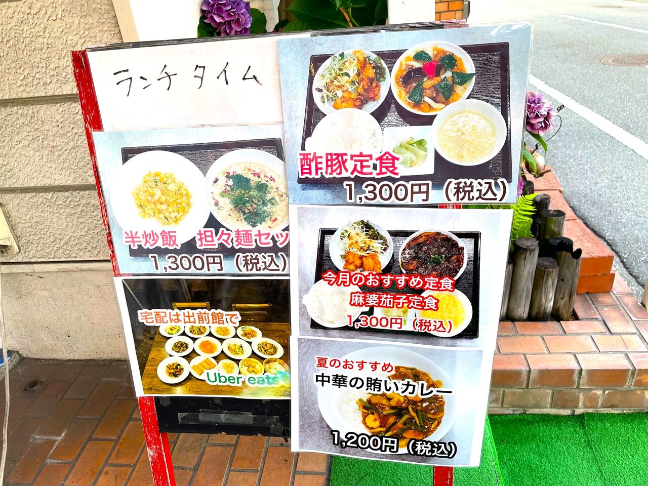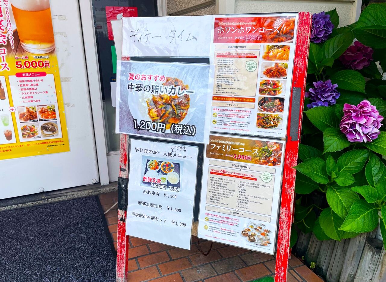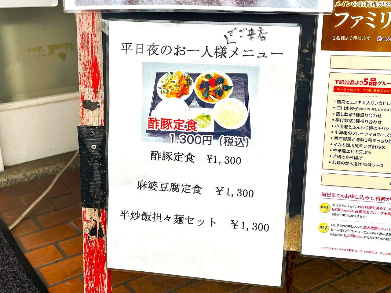 我が目を疑いましたが、何度見てもやはりランチで人気の「酢豚定食」や「半炒飯担々麺セット」がランチタイムと同じ1,300円と書かれています(しかも、抜かりなく税込であることもチェック済!)。
