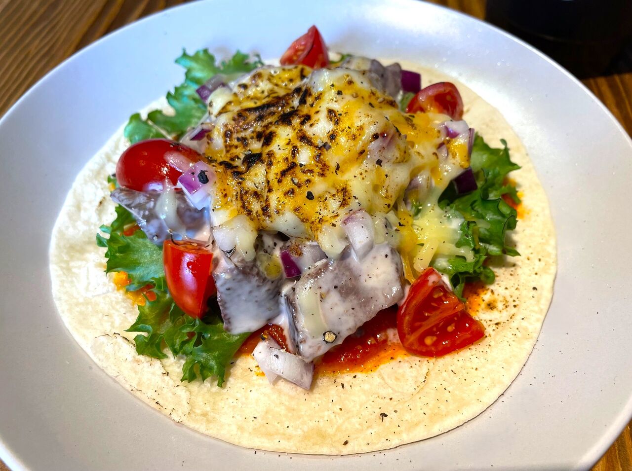 トルティーヤの上にフリルレタス、アーリーレッド、プチトマト、そして鹿肉がた~っぷり!その上には炙ったチーズがトッピングされていて、いい香りがしています。