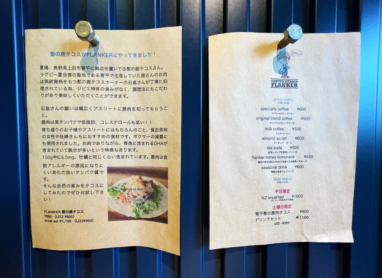 お伺いすると、ラガーマン(店名のFLANKERは、ラグビーのポジション名)の聖地・長野の菅平で夏期にキッチンカー“髭の鹿肉タコス”が登場するのだそう。(けれどお店の方は、お鬚を生やしていらっしゃらないんだとか(笑))。