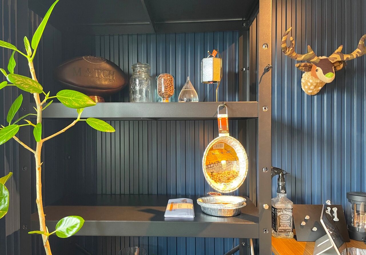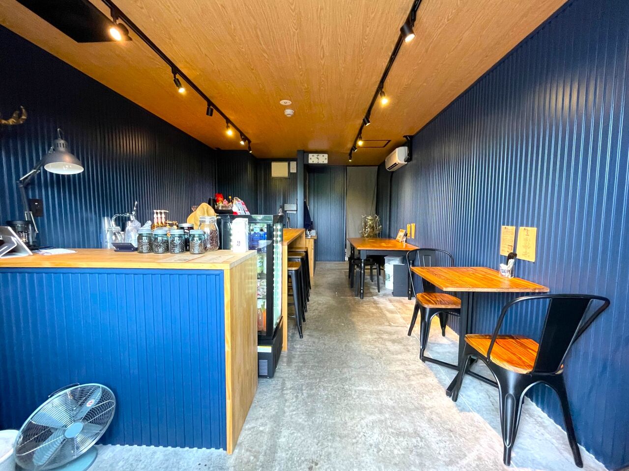 何よりコンテナを意識したというネイビーの壁が大人のシックカジュアルな空気感でかっこいい~! リニューアルしてからは、おひとり様の女性だったり、男性のお客様なども増えたのだそう。