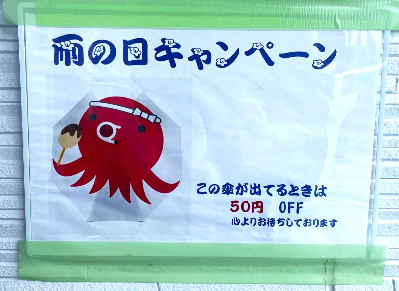 ここでお得な情報をお聞きしました。なんと「雨の日キャンペーン」として、可愛いハチマキたこちゃんの傘が店頭に出ている日はたこ焼きが50円OFFになるそうです!ぜひ雨の日には思い出して足を運んでみたいですね!