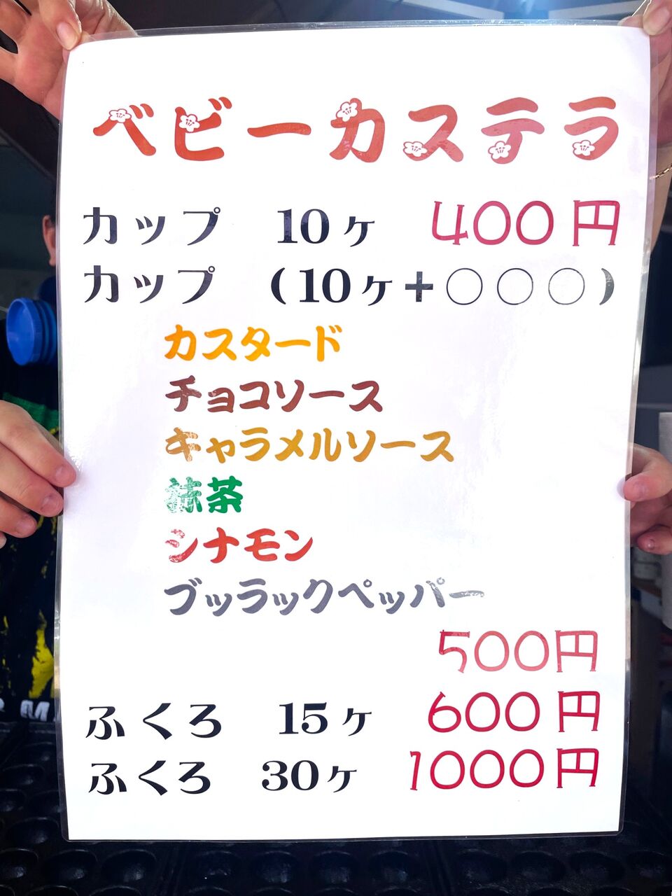 さらに取材させていただいた翌週からベビーカステラの販売も予定されていましたので、メニュー表だけ撮影させていただきました。