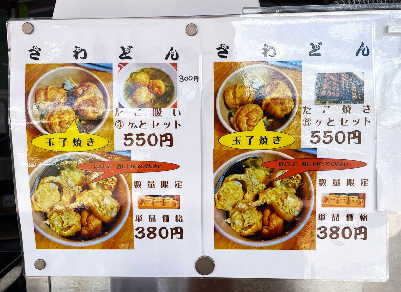 ちなみに「さわどん」はご飯の上に玉子焼きが載っているもので、「たこ吸い」は明石焼きのようにお出汁でいただくたこ焼きのようです。御飯としてもおやつとしても楽しめそうなメニューがいっぱいですね♪