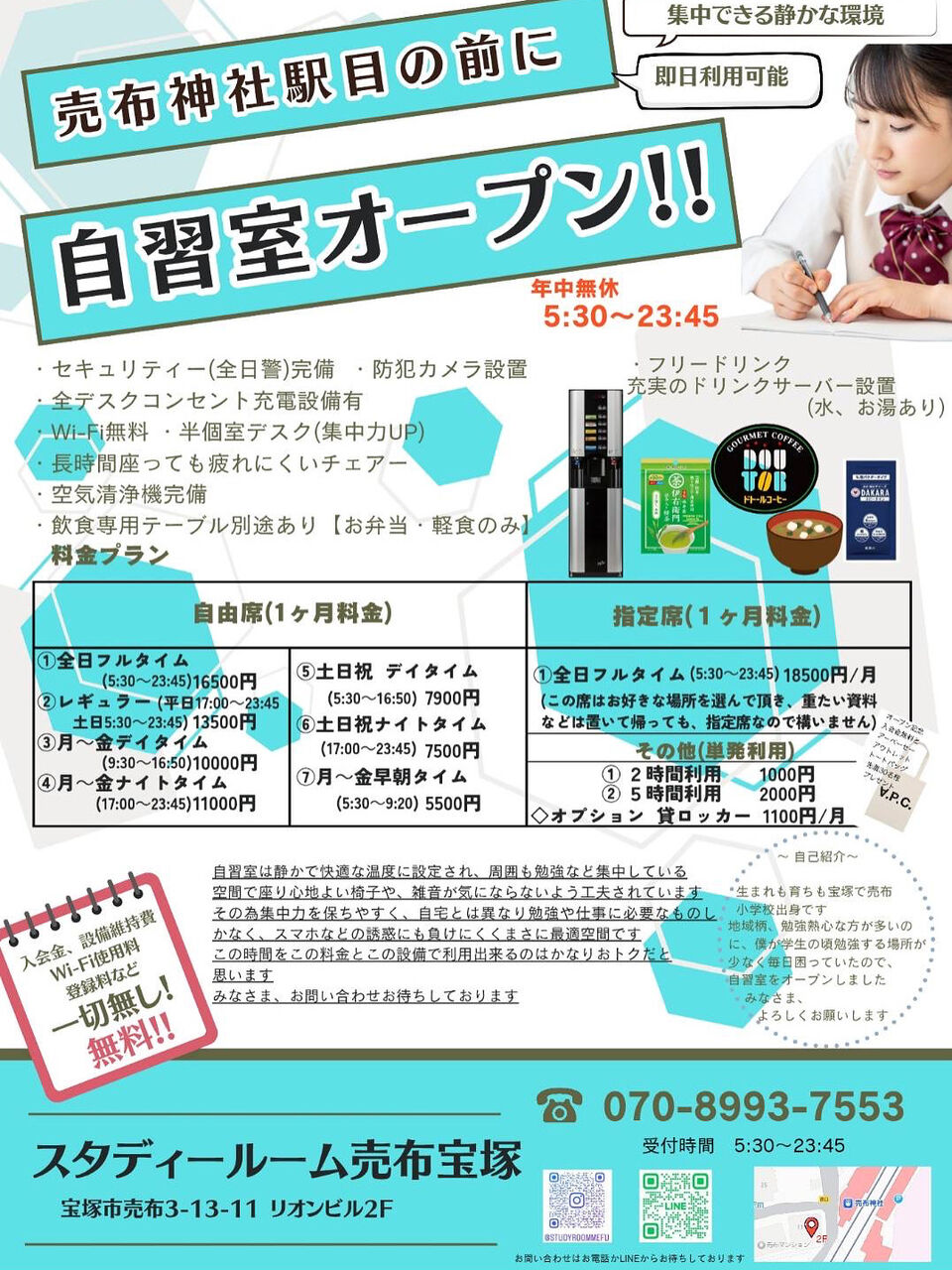 こちらは、なんと年中無休で朝5:30から夜は23:45まで開いているという、非常にありがた~い自習室。