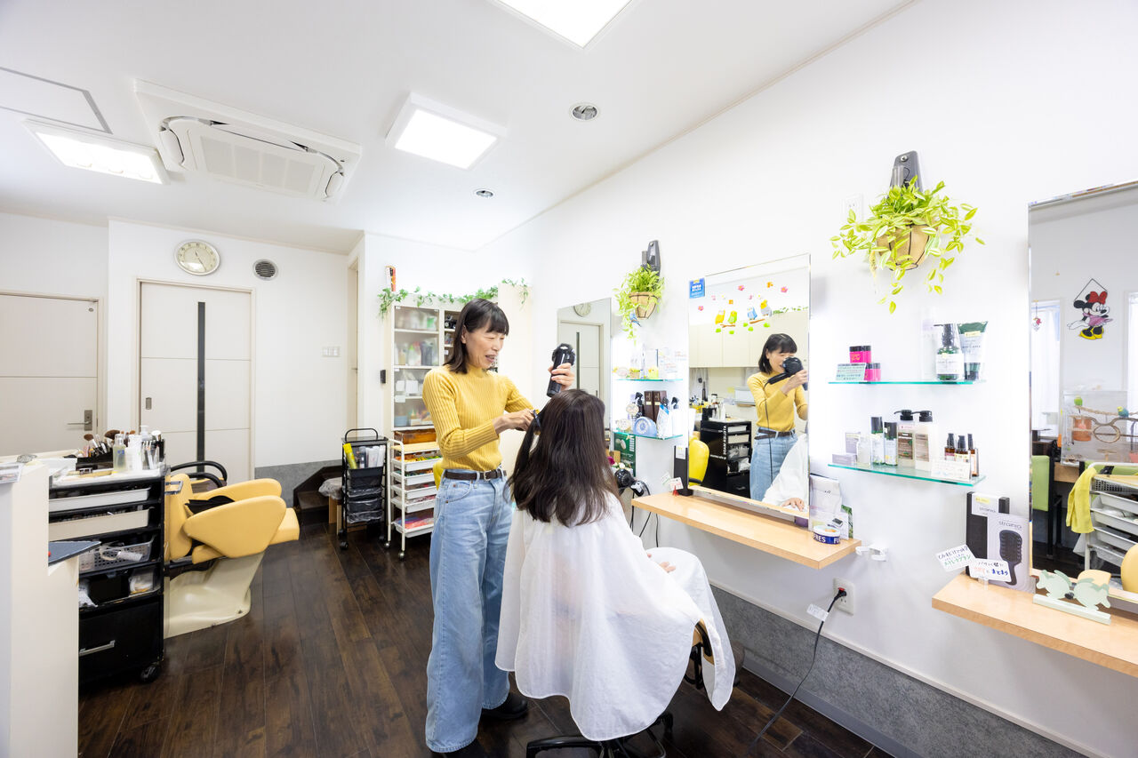 1979年に宝塚市口谷西にオープン、母娘で経営している美容室です。地域のお客さまの憩いの場であり「ここに来たらホッとする」と言ってもらえるのがうれしいとのこと。