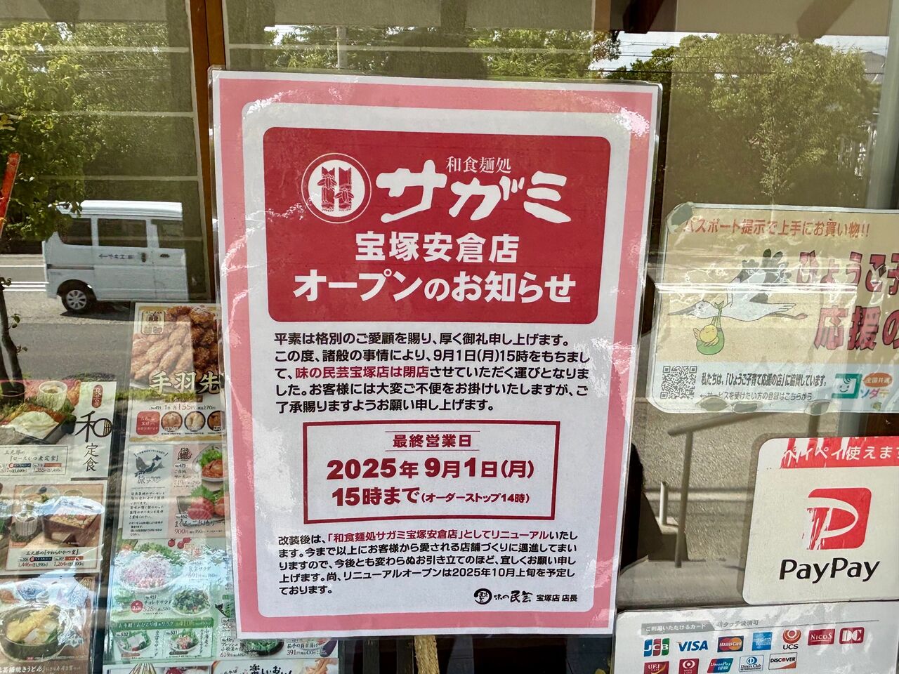 尼宝線沿いにある『味の民芸 宝塚店』が、9月1日(月)の15時に閉店するそうです。