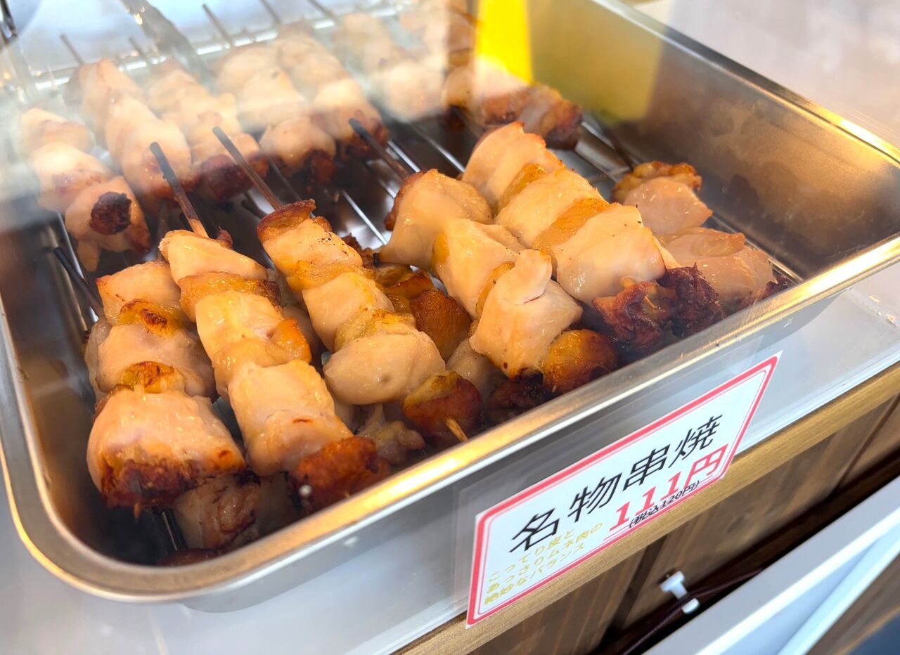 向かって左側には串コーナー。下段に噂の「名物串焼」もありました。歯応えがあって旨味の強い尻皮と柔らかくさっぱり食べられる胸肉を交互に刺しているんだそう。これは気になります!