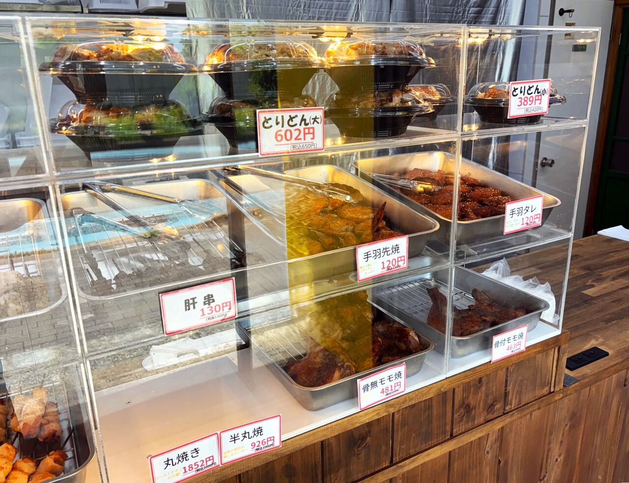 一方右側の棚にもいい焼き色のモモ焼や手羽先が!そしてとりどんは平仮名のポップですが「鶏丼」ということですよね?これは美味しいに決まってる~!