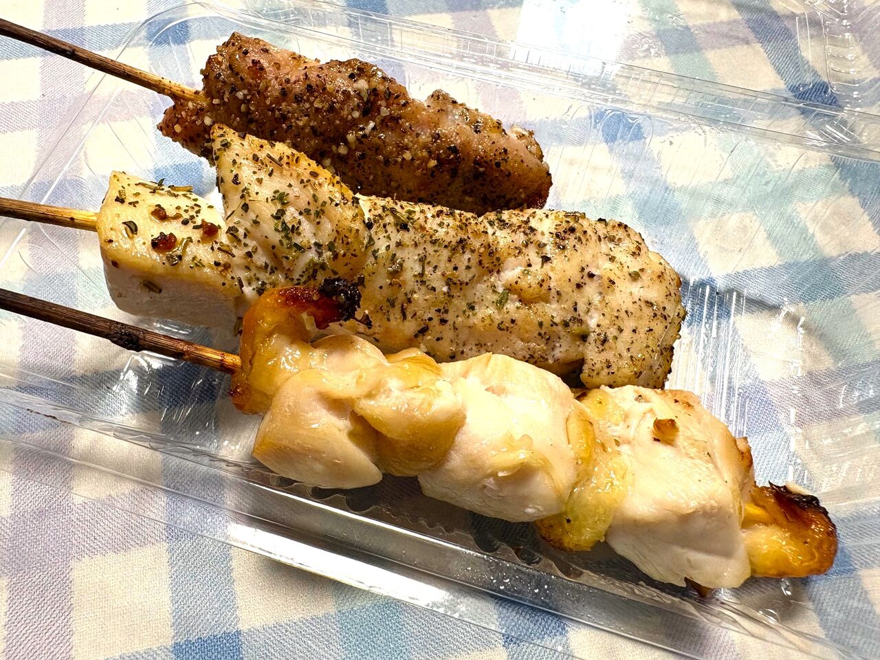 まず串3本。串は10種類近くあるので迷いましたが、名物串焼120円、ハーブチキン120円、ガーリックモモ串180円(すべて税込)にしました。