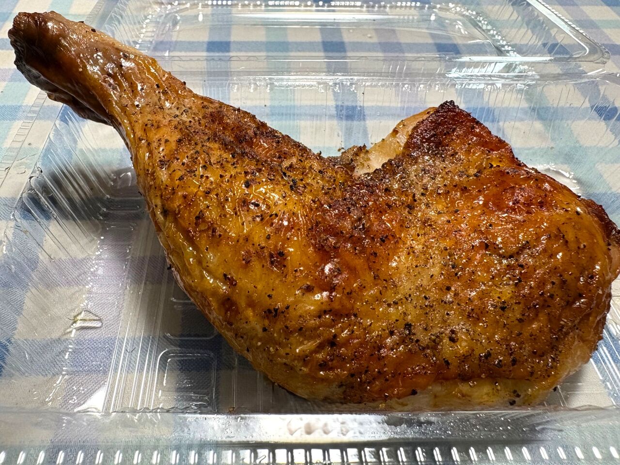 そして、こちらが骨付モモ焼500円(税込)。とりどんに骨無が載せられているとお聞きしたので、こちらは骨付にしてみました。