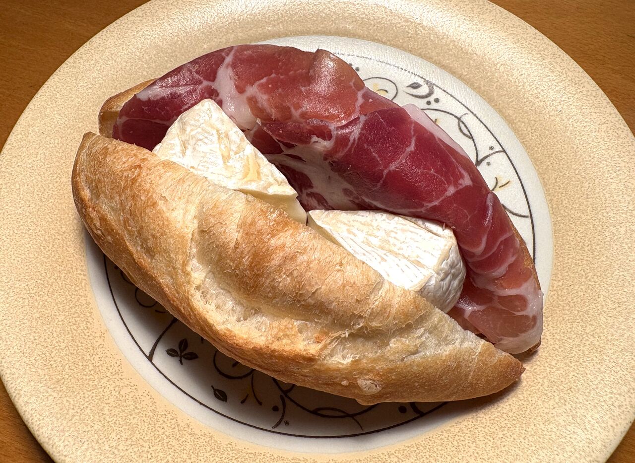 パリッとした香ばしさが味わえるフランスパン生地が美味しい~! 2切れも挟まれた大きいカットのカマンベールチーズはとろ~り、生ハムの塩味が食欲をそそり一気に食べてしまいました。これはワインとかにもハマりそうです。