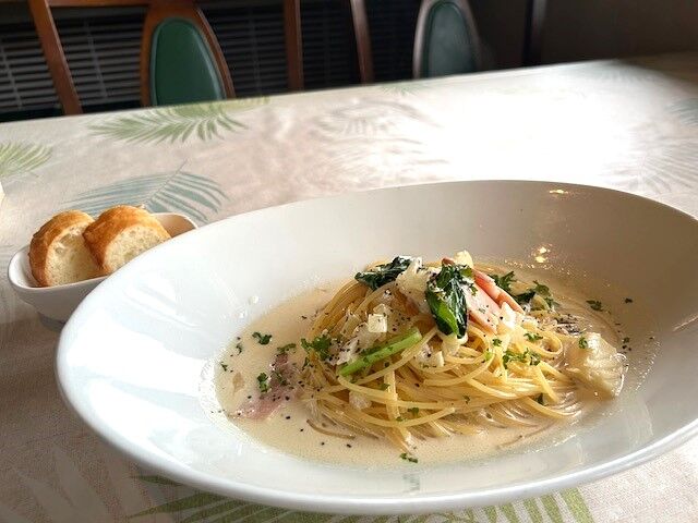 玉ねぎの甘みとロースハムと新鮮で柔らかなイカ、パスタの麵も生クリームたっぷりで優しい味のクリームソースによく絡みます。バゲットにクリームソースをしみこませて、最後まで美味しくいただきました。