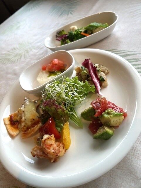 エビとパプリカの炒めもの、アボカドとマグロのわさび和え、レンコンと大根のハーブ炒め、カプレーゼ(モッツァレラチーズとトマトのジェノベーゼソース)、オクラ・ブロッコリー・カリフラワー・ニンジンなどお野菜のバルサミコ酢、ひとくちピザ…前菜は何品目使ってあるのでしょうか。目にも鮮やか、お酢やトマト・ジェノベーゼなどいろいろな味を楽しめ、満足なアンティパストです。