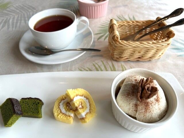①番のマスカルポーネムースのケーキを選択しました。プチケーキの抹茶はとっても濃厚でロールケーキも美味しかったです。