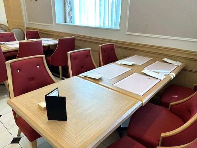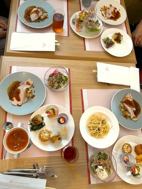 ランチ時間でお客様が次々と来られますので、テーブル席の一部を撮影させていただきました。明るく広いアンサンブルは、テーブル配置がゆったりとしているので、お客様がいらっしゃっても静かでゆっくりと楽しむことができます。宝塚歌劇の曲がBGMで流れるのも優雅な気持ちになります♪