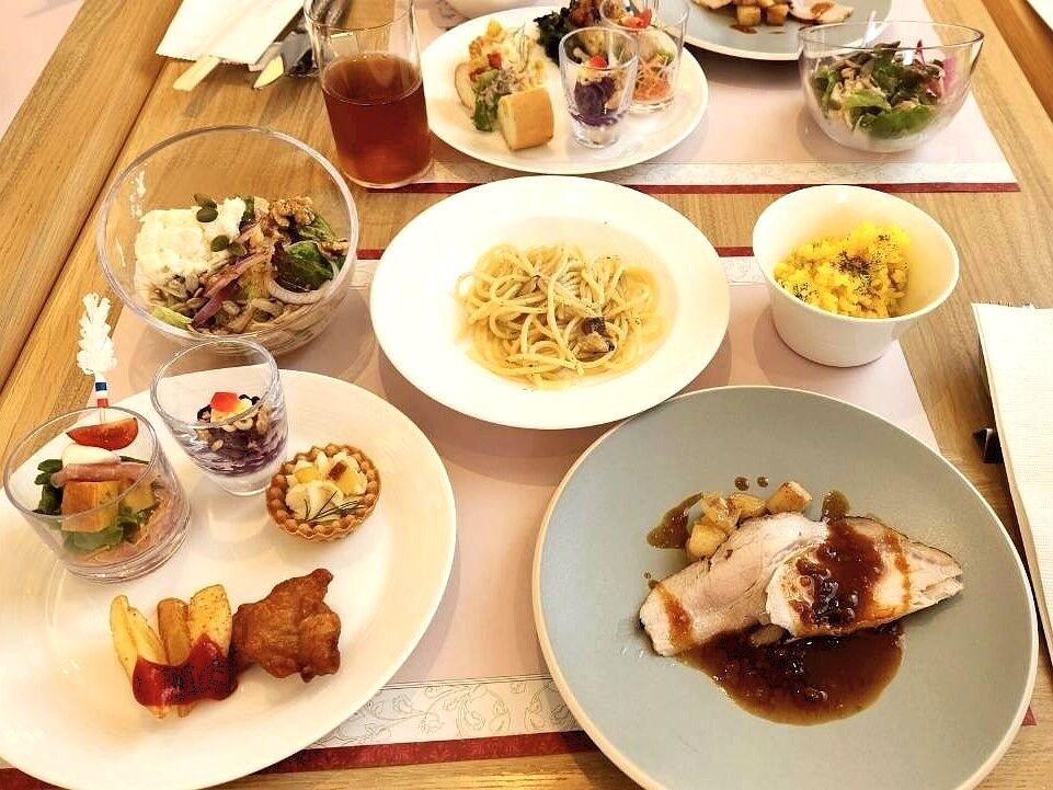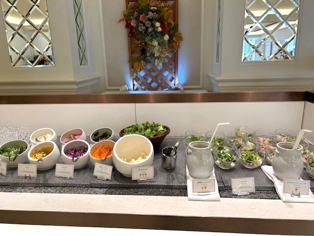 ビュッフェ形式なので、早速、お料理を取りに!とりあえず何があるか一周して確認します。サラダ、前菜コーナー、メインディッシュ、パン、ご飯やスープ、ドリンク、デザートコーナーもありました。お客様がいらっしゃるので撮影は控えめに。