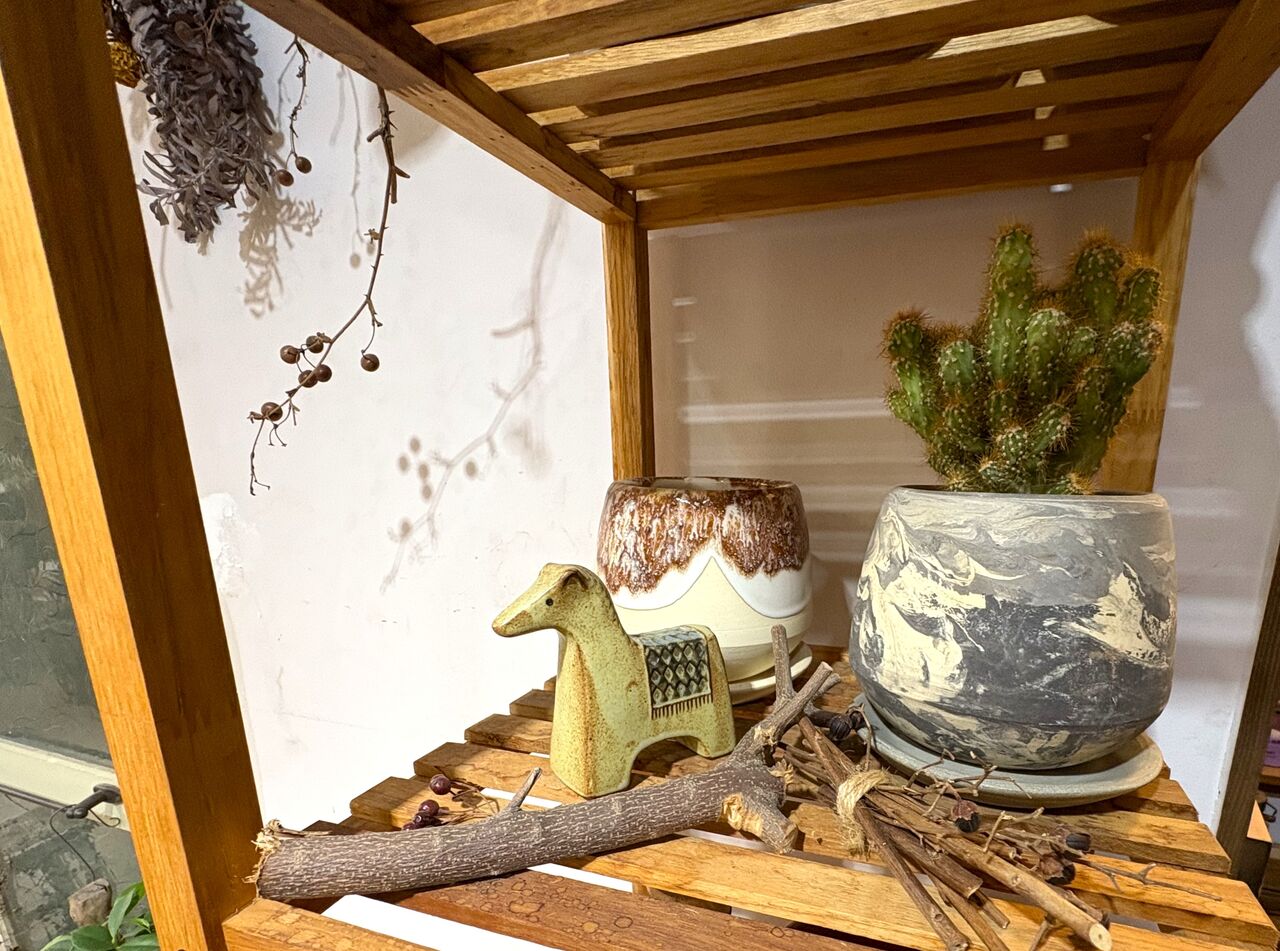 八重山そばがいただける「フラット」2階の1室。可愛らしくも元気いっぱいのグリーンやカラフルでおしゃれな鉢など、植物&ボタニカルグッズがたくさん並んでいる癒しの空間だったこともあり、コミパスタッフも幾度となく通わせていただいていたのですが…。