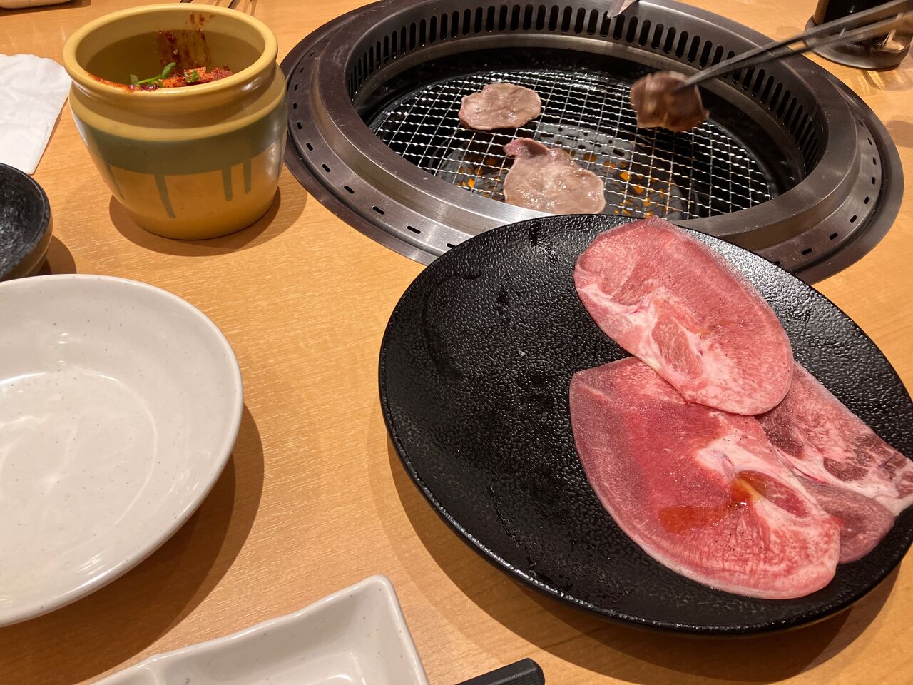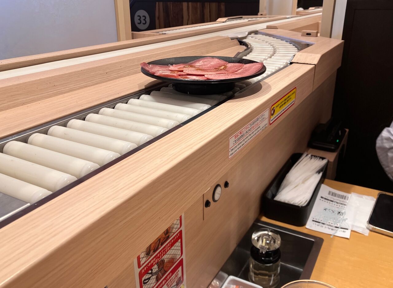 テーブル横に回る寿司のようなレーンがあって、さっそくタンがやってきました。
