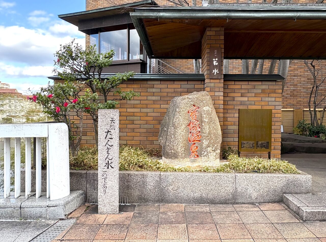 道を挟んだちょうどお向かいには、有名な「宝塚温泉」の石碑や「天然たんさん水この下にあり」の石柱がある辺りです。