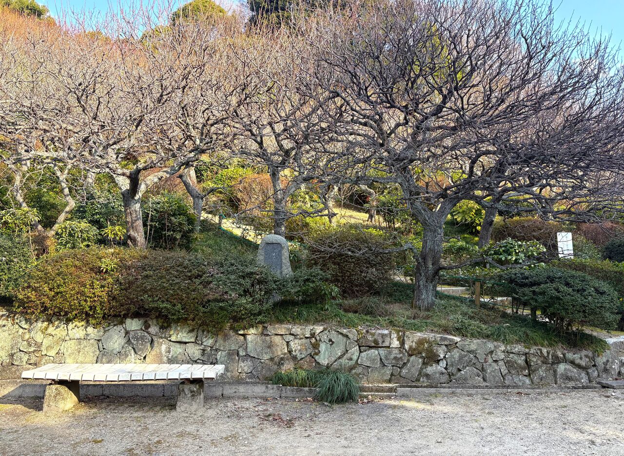 入口からまっすぐ少し進むと、すぐにベンチのある少し開けた場所に出ます。与謝蕪村はこちらにいらっしゃいました!