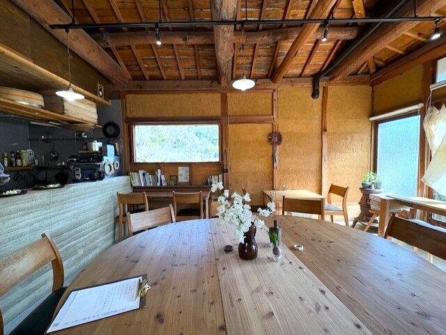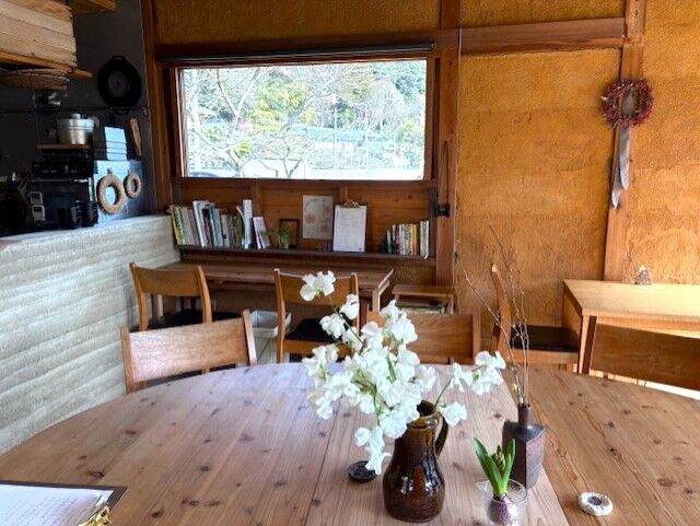 木がふんだんに使われている店内。壁は上塗りしていたものを剥がしてみたら土壁が出てきたので、それを活かした内装に、店主の出口さんも一緒に作業されたそうです。長丸の大きなテーブルが中央に、その周りのテーブル席、木枠の大きな窓に面したカウンター席も手作り!柔らかな陽射しが降り注ぎます。