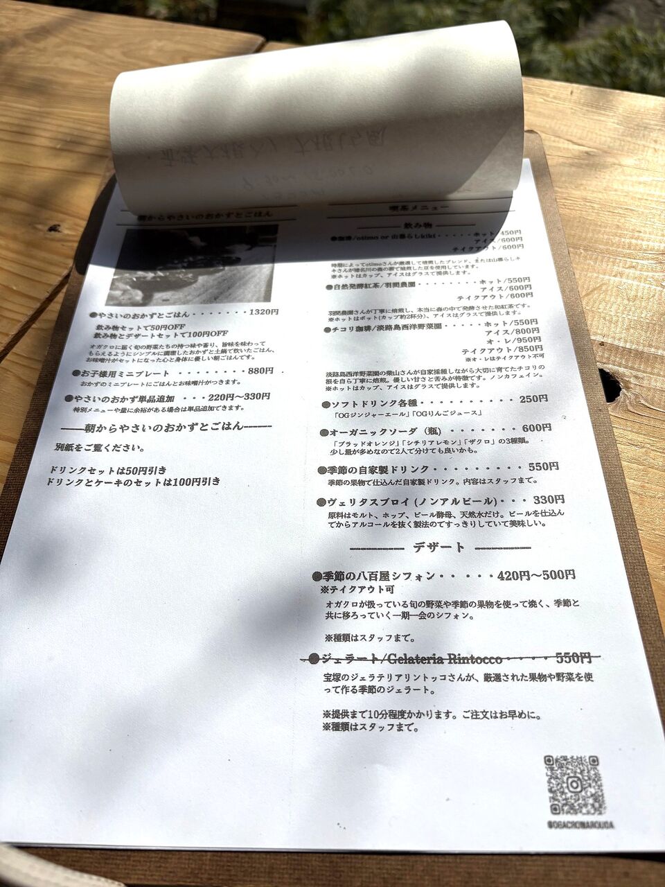 猪名川で焙煎したコーヒー、自然発酵紅茶、オーガニックソーダ、季節の自家製ドリンクなど、どれにしようか悩みます。チコリ珈琲というのもありました。淡路島西洋野菜園さんが自家採種し育てたチコリの根を焙煎した珈琲だそうです。