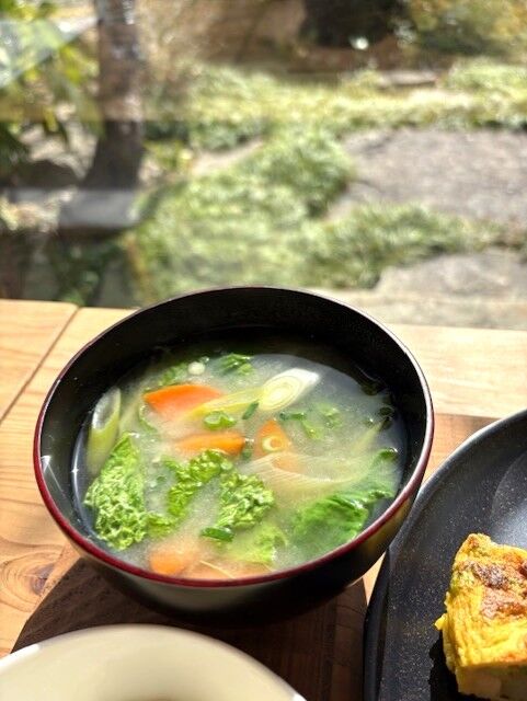 お出汁のきいたお味噌汁はニンジンと菜花と九条ネギがたっぷり!