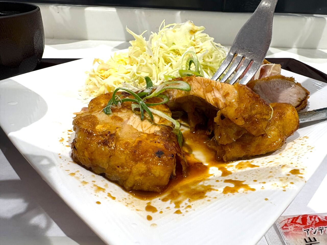 確かに厚切りです!測っていないけれど、3㎝ぐらいありそうな感じです。見た目はヘビーな感じですが、トンテキがやわらかくて、脂身まで甘く感じて美味しいんです。しょうゆベースの照り焼きソースに合います。トンカツもやわらかくて、大満足です。ご飯は少食の方には多いかと思いますので、「普通盛り」と注文の時に伝えた方が良いかもしれません。