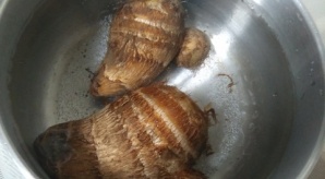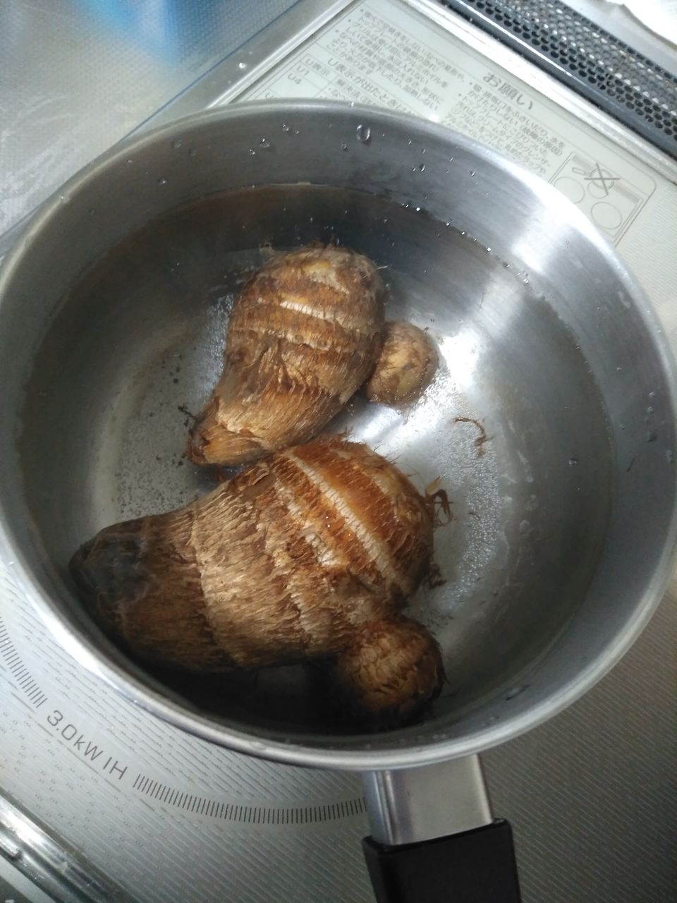 ①里芋をざっと洗って、水から約15分茹でる