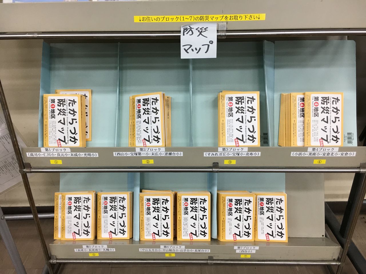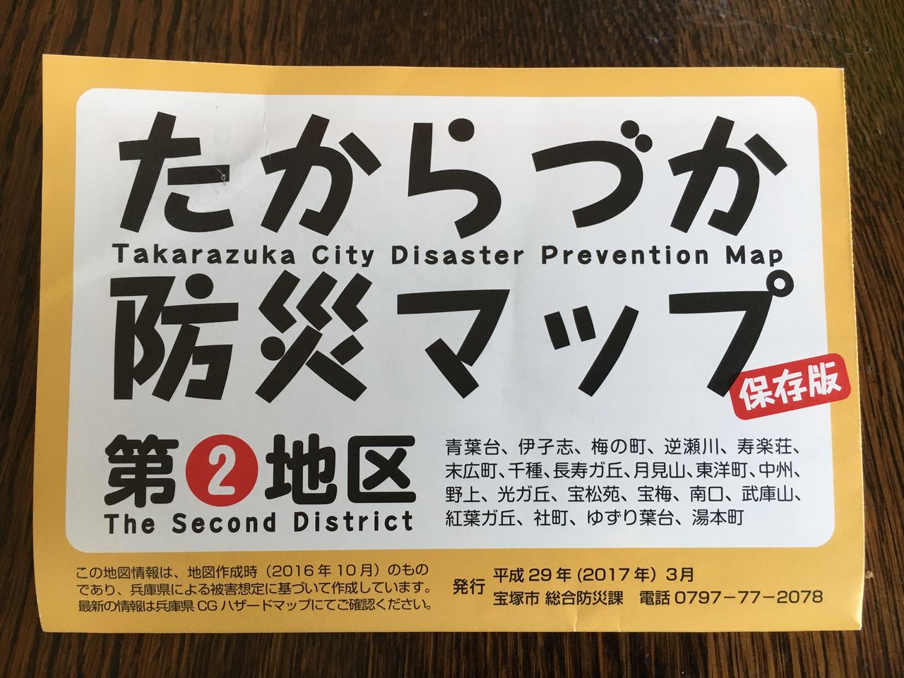 宝塚市役所で防災マップなるものが広報ラックに。災害のニュースを目にする事が多いこの頃なのに、あまり自分事で意識していない事に気づき、手にとって見てみた。マップは各地区ごとに分かれて作られている。基本的な情報として、避難所、避難地の位置が地図で示されていて、避難勧告、避難指示が発令された時にとるべき行動、などが書かれている。